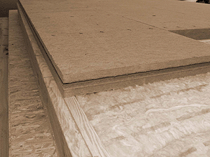 Einen weiteren Vorteil sehen wir in den hervorragenden Dämmmöglichkeiten der einzelnen Elemente. Neben einer Dämmung mit Mineralfaser oder zunehmend auch mit ökologischen Alternativdämmstoffen wird der Hohlraum zwischen den Holzständern gedämmt. Desweiteren wird eine Holzfaserplatte aufgebracht um eine durchlaufende Dämmebene und Minimierung der Kältebrücken zu gewährleisten. Die gefederte Holzfaserplatte an der Außenwand (siehe Foto) dient zugleich als Putzträger oder kann mit Holzschalung verkleidet werden. Innenseitig wird OSB-Beplankung aufgebracht und an den Stößen luftdicht verklebt. Eine zweite OSB-Schicht mit etwas Abstand zur ersten dient als Installationsebene.
